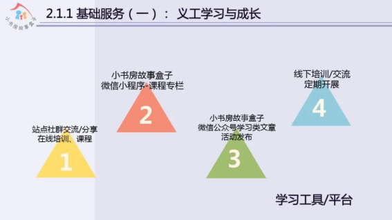作为项目服务的义工,一定要进行相应的学习与成长,这样才能成为一名合格的儿童阅读推广人。项目通过“小书房故事盒子”微信公众号、“小书房故事盒子”小程序、站点微信社群等途经,为全国小书房站点的义工伙伴提供学习与成长的工具与平台。